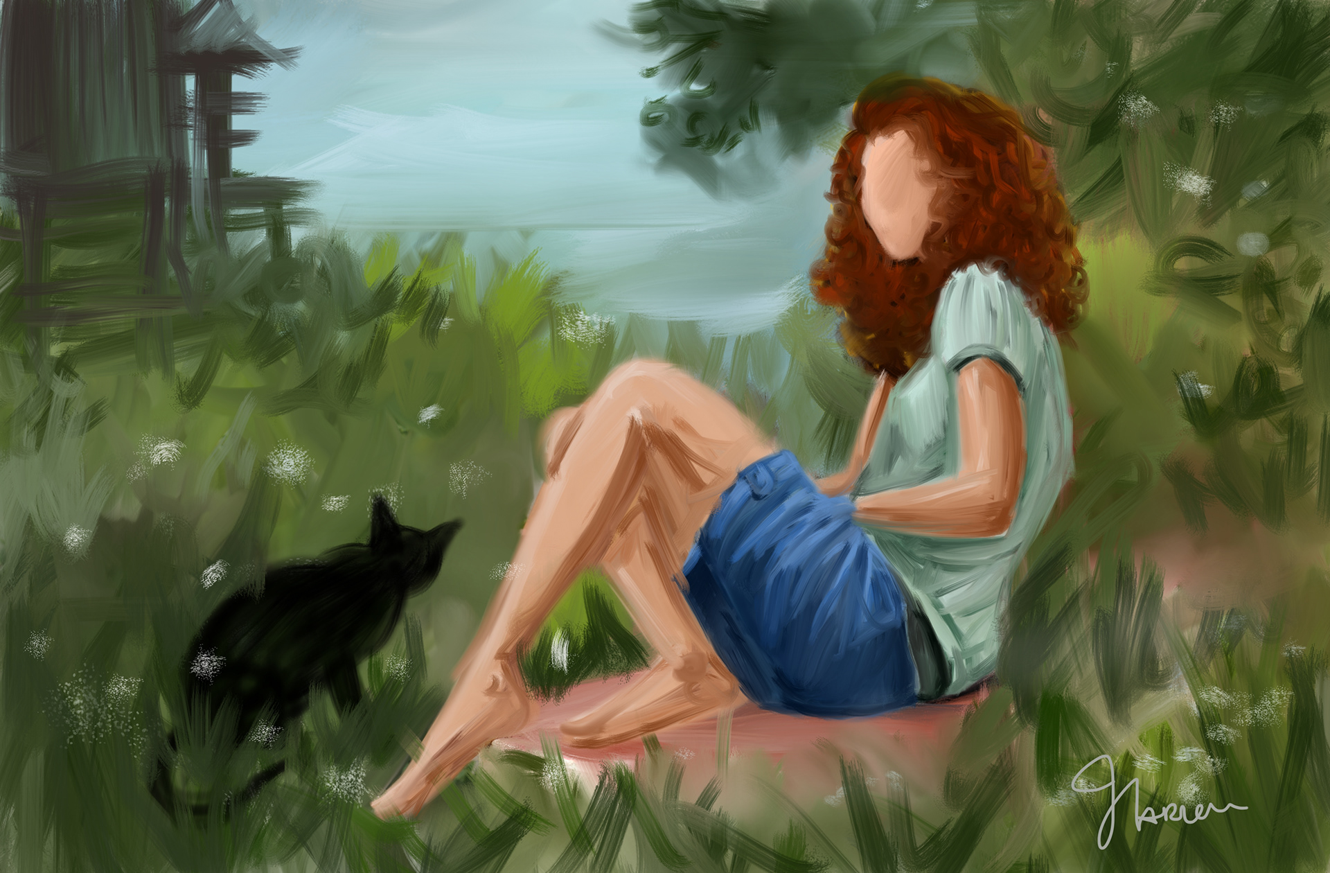 oil painting effect black cat in the garden